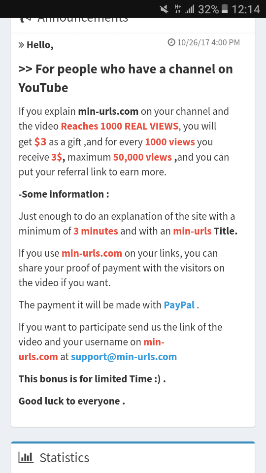مرحبا بكم في هدا الموضوع سنقوم بشرح موقعنا الحصري للربح من اختصار الروابط Min-urls مختلف عن بقية المواقع الاخرى لتوفره على ميزات جديدة و رائعة تفتقدها العديد من المواقع بدون اطالات ننتقل الى شرح الموقعالموقع جديد في الساحة يتوفر على واجهة أنيقة مع حماية 100% https://i.suar.me/r1gpE/l خصائص الموقع الموقع يتميز ب CMP أو الدفع مقابل الالف ضهور مرتفع خصوصا في الدول العربية ، حيث على سبيل المثال نجد المغرب 5 دولار مقابل الالف ضهور ونجد أيضا الجزائر 4 دولار مقابل الالف ضهور وهدا شي رائع جدا !! . كما هو على باقي الدول (شاهد الصورة أسفله ) https://i.suar.me/j8v5m/l الحد الادنى للسحب هو 1 دولار فقط ويدعم الباي بال كوسيلة للسحب و بايير والبتكوين و أيضا البنك ، وطبعا الحد الادنى للسحب يختلف حسب الوسيلة التي اخترتها للسحب !! . نسبة الربح من دعوة الاصدقاء والتي هي 30% وهدا شيء رائع ، حيث انه على سبيل المثال الشخص الدي تسجل عن طريق رابطك الخاص ربح 10 دولار ستربح انت 3 دولار بدون عمل أي جهد في اختصار الروابط و*** الترافيك لها ، وبالتالي فهدا الموقع يجب استغلاله من اليوم وتبدا في *** له الاعضاء عن طريق رابطك الخاص لربح 30% من ارباح الريفرال او دعوة الاصدقاء !! الموقع موتوق 100% أنظر إتباتات السحب من البايبل الخاص بموقعنا min-urls بفضل الله تم الدفع لأكتر من 50 عضو https://i.suar.me/8lz1X/l أما بالنسبة لاصحاب القنوات يوتيوب ، يمكنك شرح موقعنا مقابل 3 دولار ، حيث انه كل ما عليك هو عمل حلقة حول موقعنا تشرح مميزاته وكيفية استعماله ومن تم ترسل الرابط الفيديو لهم عن طريق مراسلتنا في صفحتنا أو عن طريق الايميل الخاص بنا support@min-urls.com https://i.suar.me/pXM3v/m رابط الدخول والتسجيل في الموقع min-urls https://goo.gl/RkzYVY |