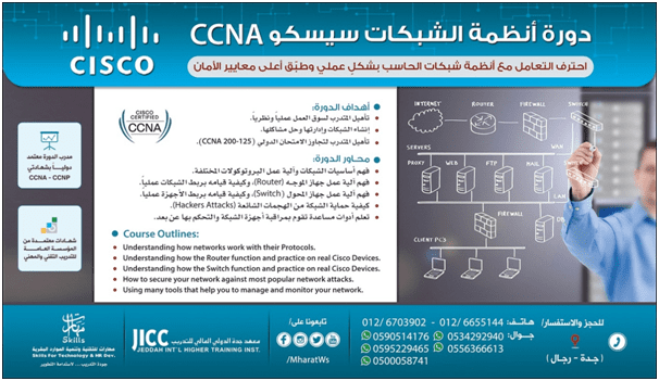 دورة أنظمة الشَّبكات سيسكو **NA احترف التعامل مع أنظمة شبكات الحاسب بشكلٍ عملي وطبِّق أعلى معايير الأمان https://i.suar.me/XPX75/m مدة الدورة (60) ساعة تدريبية تعقد الدورة بمدينة جدة في معهد جدة الدولي العالي للتدريب مدرب الدورة معتمد دولياً بشهادتي **NA & **NP شهادة الدورة معتمدة من المؤسسة العامة للتدريب التقني والمهني برقم ( 252229611 ) (( للاستفسار نرجو التواصل عبر الجوال أو الهاتف )) مدينة جــــدة / رجال 0126655144 -- 0126703902 0534292940 -- 0590514176 0595229465 -- 0556366613 0500058741 (( سارع بحجز مقعدك الآن وسجل عبر الرابط التالي )) ظ…ظ‡ط§ط±ط§طھ ظ„ظ„طھط¯ط±ظٹط¨ بريد إلكتروني: info@mharat.com.sa للاطلاع على الدليل التدريبي لشركة مهارات أنقر على الرابط: http://bit.ly/1xMUg0O إسأل ايضا عن دورة صيانة برمجيات الجوال https://i.suar.me/5pBWK/m |