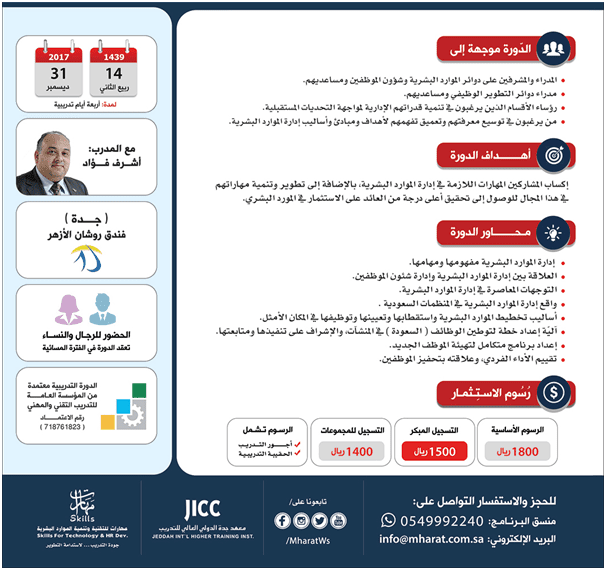 دورة أخصائي إدارة الموارد البشرية زيادة الإنتاجية ونجاح المنظمات ... تتحقق بالإدارة الاحترافية للمورد البشري https://i.suar.me/WWdaw/m مع المدرب/ أشرف فؤاد (( للرجـــال وال**** )) مدة الدورة أربعة أيام ( فترة **ائية ) (( جــدة )) بتاريخ31 ديسمبر 2017م الموافق14 ربيع الثاني 1439هـ تعقد الدورة في فندق روشان الأزهر معتمدة من المؤسسة العامة للتدريب التقني والمهني برقم ( 718761823 ) للتسجيل أو الحجز أنقر على الرابط: ظ…ظ‡ط§ط±ط§طھ ظ„ظ„طھط¯ط±ظٹط¨ للاستفسار نرجو التواصل عبر الجوال أوالواتسأب: 0549992240 بريد إلكتروني: info@mharat.com.sa للاطلاع على الدليل التدريبي لشركة مهارات أنقر على الرابط: http://bit.ly/1xMUg0O https://i.suar.me/XPjl5/m إسأل عن دورة صيانة الجوال ظ…ظ‡ط§ط±ط§طھ ظ„ظ„طھط¯ط±ظٹط¨ https://i.suar.me/5pM9K/m سجلو أيضا في عروض نهاية العام واحجزوا مقاعدكم فيها ظ…ظ‡ط§ط±ط§طھ ظ„ظ„طھط¯ط±ظٹط¨ https://i.suar.me/2eVoQ/m |