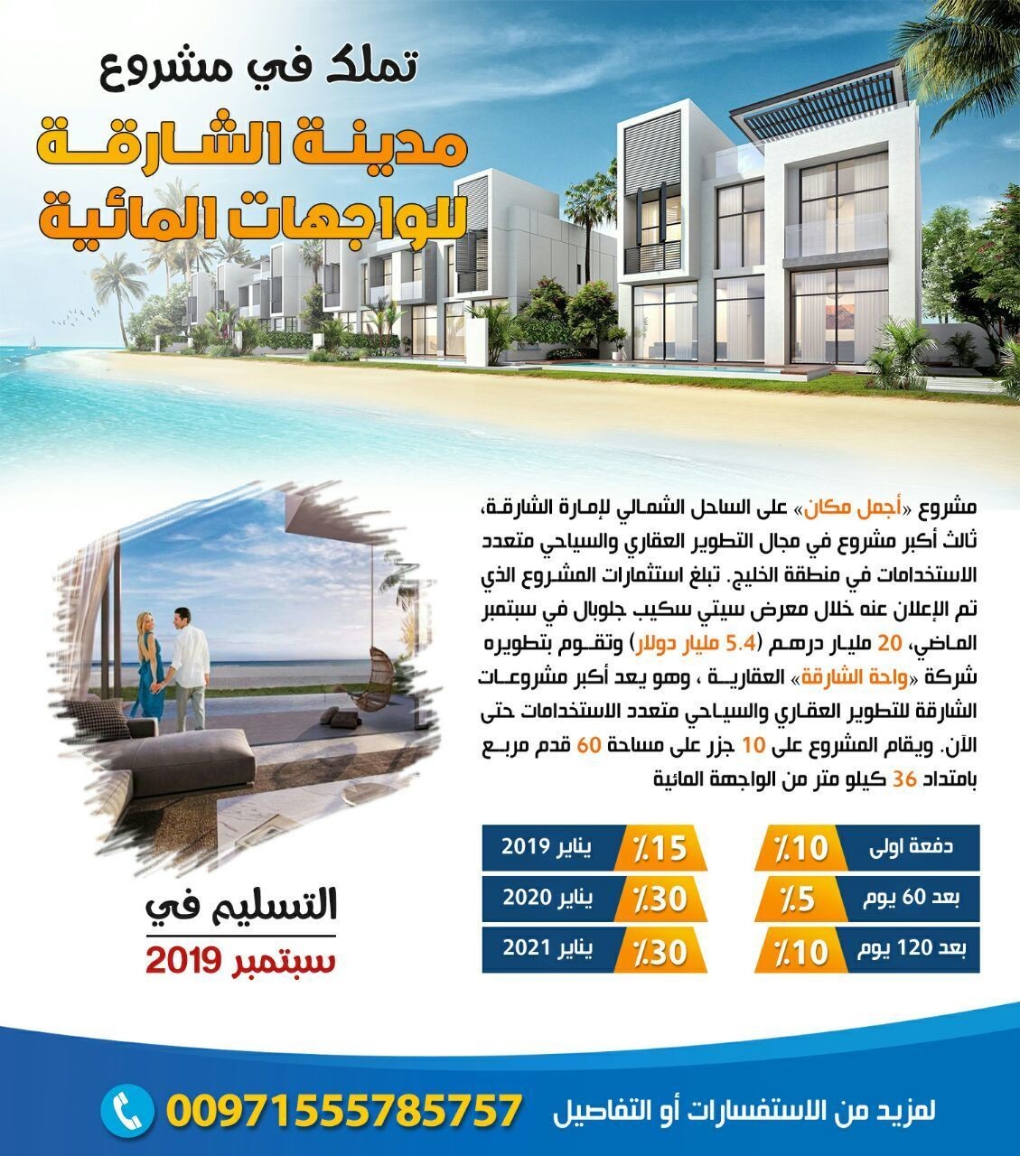 https://i.suar.me/OVnwG/l تملك في مشروع «مدينة الشارقة للواجهات المائية» مشروع «أجمل مكان» على الساحل الشمالي لإمارة الشارقة، ثالث أكبر مشروع في مجال التطوير العقاري والسياحي متعدد الاستخدامات في منطقة الخليج. تبلغ استثمارات المشروع الذي تم الإعلان عنه خلال معرض سيتي سكيب جلوبال في سبتمبر الماضي، 20 مليار درهم (5.4 مليار دولار) وتقوم بتطويره شركة «واحة الشارقة» العقارية، وهو يعد أكبر مشروعات الشارقة للتطوير العقاري والسياحي متعدد الاستخدامات حتى الآن. ويقام المشروع على 10 جزر على **احة 60 قدم مربع بامتداد 36 كيلو متر من الواجهة المائية. لمزيد من الاستفسارات أو التفاصيل : 00971555785757 https://i.suar.me/Nwn7O/l |