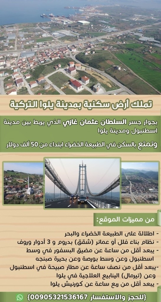 تملك أرض سكنية بمدينة يلوا التركيه بسعر ابتداء من 50 ألف دولار - اطلاله على الطبيعه الخضراء والبحر - نظام بناء فلل او عمائر (شقق) بدروم و 3 ادوار وروف - يبعد اقل من ساعه عن مضيق البسفور وسط اسطنبول وعن بورصة وعن بحيرة صبنجه - يبعد اقل من نصف ساعه عن (تيرمال) الينابيع ال****ية في يلوا للحجز والاستفسار على الجوال فقط ( اتصال او واتسب ) 00905321536167 https://i.suar.me/335p4/l https://i.suar.me/r1PKJ/l |