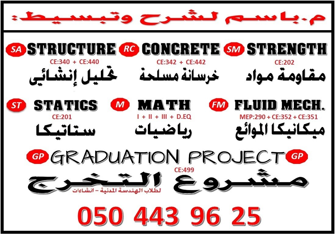 مدرس :مهندس مدني انشائي درس مواد الهندسة المدنية والسنة التحضيرية التلحليل الإنشائيStructural Analysis الخرسانة ال**لحة RC(Concrete) مقاومة المواد Strength of Materials الستاتيكا Statics ميكانيكا الموائعFluid Mechanics الرياضيات والفيزياء والإحصاء. ومشروع التخرج لطلاب الهندسة المدنية تخصص انشاءات متواجد في الفصل الصيفي 0504439625 https://i.suar.me/Oq51G/l