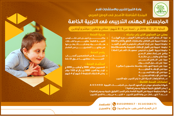 الماجستير المهنى التدريبى فى التربية الخاصة المنحة الشاملة الأضخم و الأكثر تخصصا و عمقا فى الوطن العربي من واحة التميز للتدريب البداية 21 - 12 - 2018 م ، لمدة من 6 : 8 شهور مباشر و أونلاين – عملى و نظرى التخصصات ( التخاطب و اضطرابات النطق أو صعوبات التعلم أو الإعاقة العقلية ) نخبة من عمالقة المتخصصين بخبرات تتعدى 22 عاما من الخبرة خصم خصم حتى الثلاثاء القادم 11 ديسمبر 2018 م 500 ج للمصريين و 1000 ريال للإخوة العرب أو ما يوازيها بالدولار للإطلاع على آراء المشاركين فى برامج واحة التميز الضغط على الرابط التالى L9pQ3 يمكن الاشتراك : فى الماجستير المهنى فى التربية الخاصة للتواصل على البيدج الرئيسى لواحة التميز للتدريب على الرابط التالى https://www.facebook.com/WahaELTamyooz/ ikNBg للإطلاع على تفاصيل المنحة الشاملة لل**** السلوكى المعرفى PcgtU رابط التسجيل فى المنحة الشاملة لإعداد أخصائى التربية الخاصة NjLJz https://i.suar.me/G1N8m/l بعض من المحتوى الذى يتم دراسته : 1- دورة الــــــتدخل المبــــــكــــر من خلال ( البورتيدج و الهيلب ) 2 - دبلومة تدريبية فى التخاطب و اضطرابات النطق والكلام ( كاملة) 3 - دبلومة تدريبية فى إعداد أخصائى تشخيص و تأهيل التوحــــد 4 – دبلومة تدريبية فى تأهيل الإعاقات المزدوجة و المتعددة( كاملة ) 5 - دبلومة تدريبية تأهيل و تشخيص صعوبــــات التعــــلم ( كاملة ) 6- برنامج فى إعداد معلم الـــدمـــج NEW 7 - دورة **** وظيفى مكثـــفة 8 - دورة فى التـــكامل الحــــسى 9 - دورة فى تعــــــديل السلــــــوك 10 - دورة فى تنمية المهارات بفلسفة منتسورى ( مجالين ) 11 - دورة فى الإعاقــــة العقليـــــة 12 - دورة فى الإعـــاقة البصــــرية 13 - دورة فى الإعـــاقة السمعـــيـــة 14- مــــــادة الاتجاهات الحديثة لكل ما يتم التدريب عليه التدريب هــــدية المنحــــة : NEW برنامج تدريبى فى مقاييس التربية الخاصة مقاييس و اختبارات مــــلاحظة هــــامة : هناك مواد و مفــاجآت يعلن عنها فى وقتها إن شاء الله تعالى للمتمـيزين فى الماستر الاعتمادات للمنحة كاملة : شهادة بماجستير مهنى من المعهد الامريكى للدراسات التربوية A I E S H R D ( يمكن التوثيق خارجية امريكية برسوم إضافية ) شهادة بدبلومة تدريبية فى التربية الخاصة موثقة بختم النسر ( يمكن التوثيق خارجية برسوم إضافية ) عدد 7 شهادات من واحة التميز للتدريب و الاستشارات + كارنيه من واحة التميز للتدريب الاستثمــــار مع إمكانية السداد الثلث أولا و الباقى على 3 شهور : للمصريين مباشر 5999 ج و أونلاين 6999 ج للإخوة العرب 5000 ريال 1335 $ يمكن الاشتراك : فى الدبلومة التدريبية 3 شهور أو 4 شهور خصم خصم خصم 1000 ج للمصريين و 1000 ريال للإخوة العرب حتى 30 نوفمبر 2018 م الرسوم غير شاملة التوثيق خارجية أو مصاريف الشحن للشهادات خارج مصر للتواصل : 00201141568171 – 00201016990017 متوفر واتساب و فايبر عنوان واحة التميز : 2 شارع الزهراء الدقى بالقرب من مترو البحوث – الجيزة – مصر المنحة الثانية المنحة الشاملة لإعداد أخصائى التربية الخاصة البداية 21 نوفمبر 2018 م لمدة 4 شهور - عملى و نظرى – مباشر و أونلاين المدربون : نخبة من عمالقة المتخصصين أصحاب الخبرات معظمها فوق 22 عاما https://i.suar.me/yqwYo/l المحتــوى يضــم : 1 - دبلومة تدريبية فى التخاطب و اضطرابات النطق 2 - دبلومة تدريبية فى إعداد أخصائى التــوحد 3 – برنامج تدريبى فى إعداد ***** سلوكى و معرفى NEW 4- برنامج تدريبى فى صعوبات التعلم 5 – برنامج تدريبى فى التدخل المبكر الهــد ية : - برنامج تدريبى فى تأهيل الإعاقات المزدوجة و المتعددة NEW - دورة تضم 5 اختبارات و مقاييس في التربية الخاصة الاعتمادات للمنحة كاملة : شهادة بدبلومة تدريبية فى التربية الخاصة موثقة بختم النسر ( يمكن التوثيق خارجية برسوم إضافية ) شهادة بدبلومة تدريبية من المعهد الامريكى للدراسات التربوية A I E S H R D عدد 5 شهادات من واحة التميز للتدريب بالشعار الذهبى شهادة من واحة التميز بالتدريب العملى + كارنيه من واحة التميز للتدريب الاستثمــار حسب المدة الزمنية و المحتوى : يم