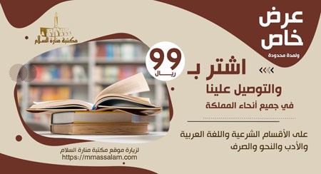 https://i.suar.me/dXXgJ/l اشتر ب 99 ريال *والتوصيل* علينا في جميع انحاء المملكة، علي الأقسام الشرعية واللغة العربية والأدب والنحو والصرف للحصول على العرض استخدم هذا الكود 99sr عند اتمام عملية الشراء في الموقع mmassalam.com لزيارة موقع المكتبة على تويتر twitter.com/mmassalam |