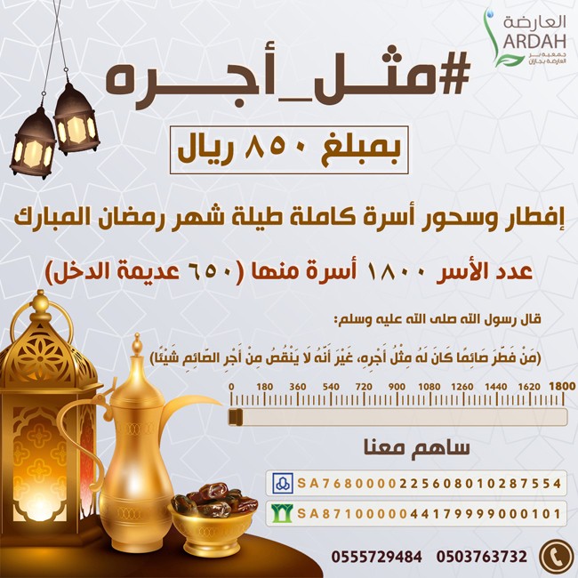 https://i.suar.me/EydO3/l مثل أجره مشروع لإفطار وسحور 1800 أسرة (منهم 650 أسرة معدمة الدخل) طوال شهر رمضان بمبلغ 850 ريال إفطار وسحور أسرة كاملة طوال شهر رمضان المبارك لمزيد من التفاصيل توجه للرابط التالي https://birr230.tawasulsa.com/?ads=web-kh02 ساهم معنا .. نستقبل تبرعاتكم على الحسابات التالية: الراجحي SA7680000-225608010287554 الاهلي SA87100000-44179999000101 اتصل بنا 0555729484 0503763732 تأسست جمعية البر الخيرية بالعارضة بجازان في 18/11/1422هـ. تم تسجيل الجمعية في وزارة الشؤون الإجتماعية بتاريخ 21/7/1423هـ. الرقم الوزاري (230) الموقع الرسمي للجمعية https://www.birr230.org.sa |