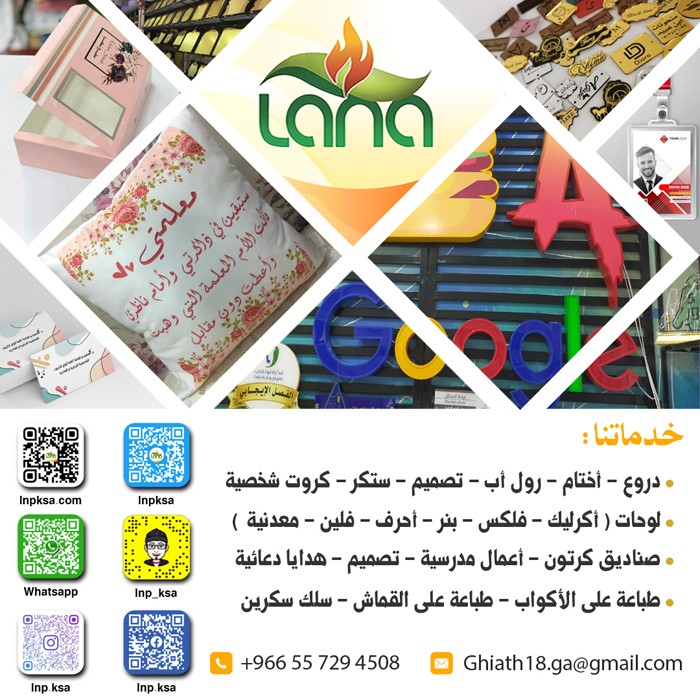 مطابع لانا الوطنية مركز متخصص في مجال الدعاية و الإعلان و التصميم الإحترافي و الطباعة عالية الجودة و صناعة الهوية التجارية المميزة و إدارة ال***ات التسويقية و الدعائية مع خبرة لسنوات عديدة في هذا المجال.و كادر إداري و تنفيذي متميز و ذو كفاءة عالية . مقرنا الرئيسي في : مدينة الرياض في المملكة العربية السعودية و منتجاتنا تصل لجميع أنحاء المملكة العربية السعودية . و نقدم أفضل الحلول لتحقيق الدعاية الإعلانية و تعزيز أهداف العملاء. و هنا فيديو توضيحي لمطابع لانا الوطنية : https://youtu.be/XT9HafbeUxA |