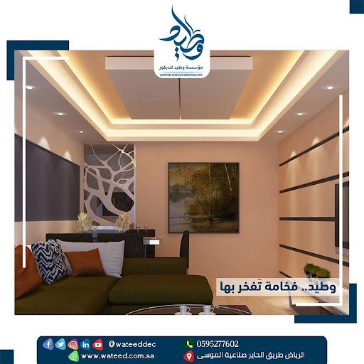 تقدم مؤسسة وطيد للديكور خدماتها المختلفة في عالم التصاميم والديكورات من خلال خبراء متخصصين في عدة مجالات هندسية وفنية لإخراج الأعمال أفضل جودة، حيث تقدم المؤسسة مختلف الخدمات في تنفيذ الديكورات الداخلية مثل الجبس بورد والاسمنت بورد وبديل الرخام وورق الجدران الثلاثي الأبعاد وإطارات الفوم والأوبن بوك والاستيل وبديل الخشب والتكسيات الجدارية الحجرية والصخرية والدهانات.