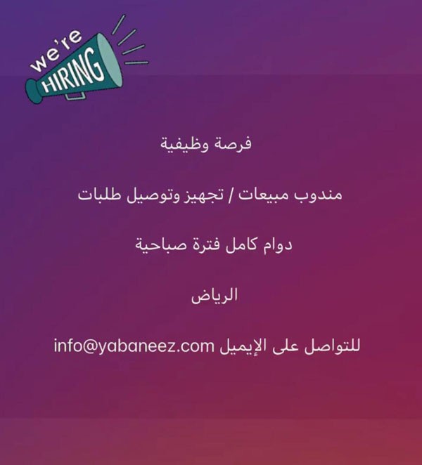 فرصة وظيفية مندوب مبيعات - تجهيز وتوصيل طلبات دوام كامل - فترة صباحية الرياض للتواصل على الإيميل التالي: info@yabaneez.com https://i.suar.me/18rdK/l |