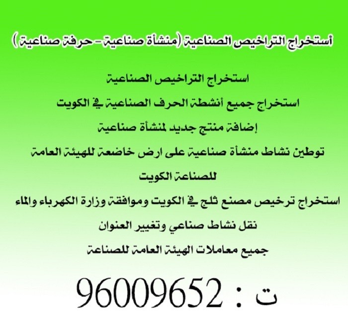 استخراج جميع أنشطة الحرف الصناعية في الكويت tel : 96009652 مكتب استخراج تراخيص صناعية |