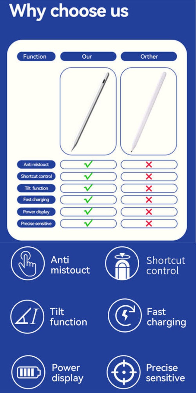 أفضل بديل لقلم ابل! قلم ايباد مثالي لتدوين الملاحظات والرسم للطلاب والرسامين بسعر مميز، تم اختياره بناءً على دراسة عميقة لقوة المنتج. القلم يأتي مع الشاحن ورأسين لتبديل الأطراف. الخصائص | [ راحة اليد ] امكانية الكتابة على الآيباد واليد على الشاشة. [ وقت عمل يدوم ساعات طويلة ] بطارية مدمجة قابلة لإعادة الشحن بقوة عالية. [ تشغيل وإيقاف بنقرة ] لا توجد حاجة لإعدادات أخرى، ببساطة اضغط على الجزء العلوي من القلم ضغطه مطولة لتشغيل أو إيقاف القلم واستخدمه مباشرة على الآي باد. [ مغناطيس لاصق ] يمكن وضع الجزء ال**طح على الجانب الأيمن من الآي باد، وسوف يتم تثبيته مغناطيسيًا. [يدعم الميل] يمكنك استخدام القلم في وضع مائل لخلق وزن خط ديناميكي (اعتمادًا على التطبيق الذي تستخدمه). |